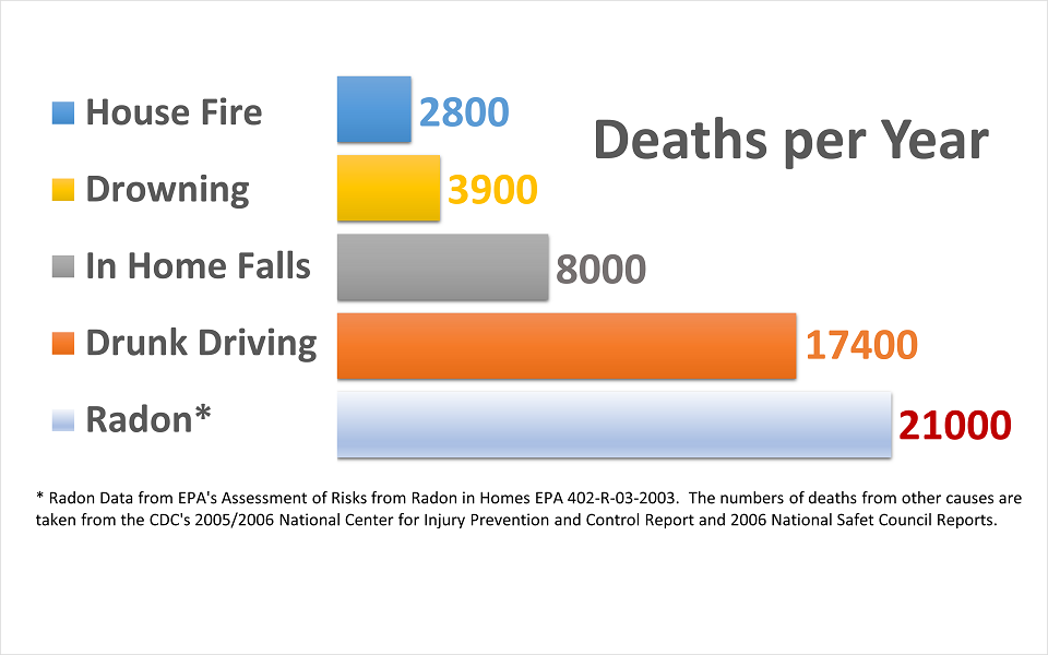 Radon is the second leading cause of lung cancer and the cause of more home related deaths than home fires, drowning, and in home accidents...combined. It is even more deadly than drunk driving! Monitoring your indoor air for Radon is easy, affordable, and helps you to identify potential exposure to take actions!